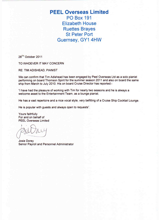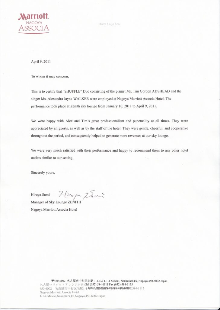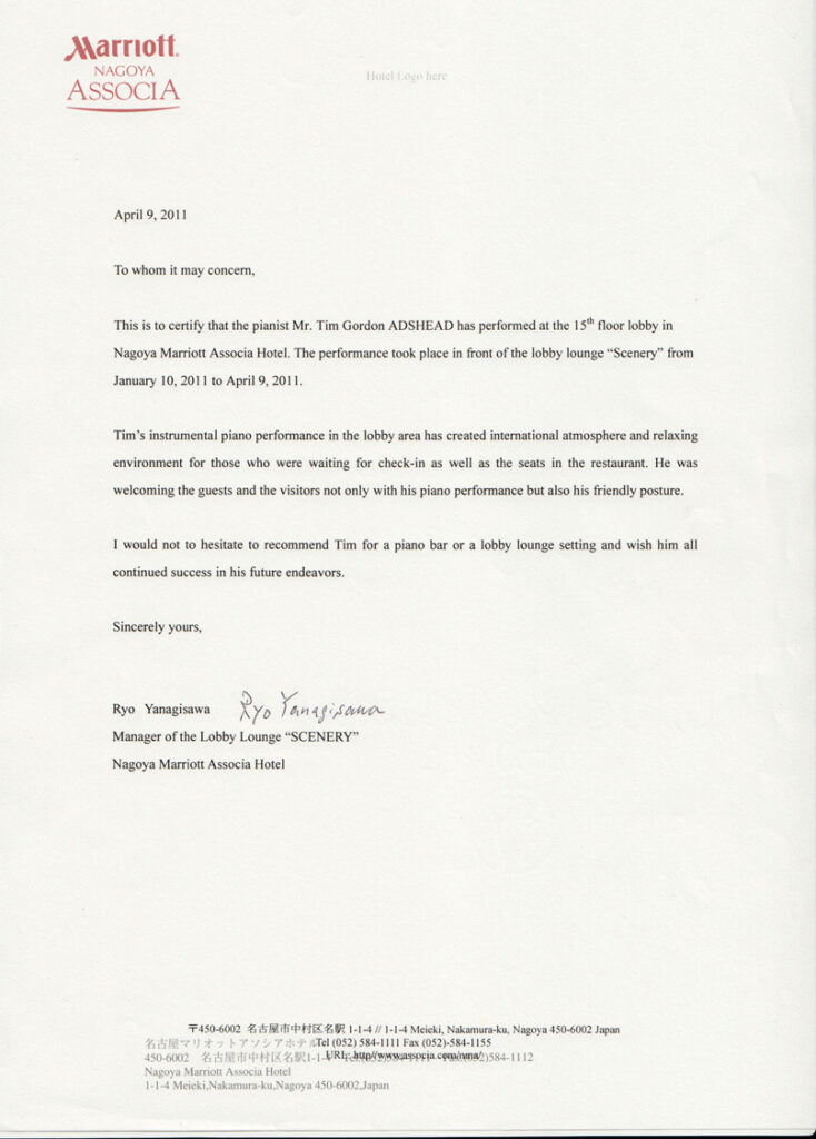 Please see below for references from the Nagoya Marriot hotel in Japan for both solo piano and duo work. There is also a reference for cruise work from a few contracts undertaken with Thompson cruises. References from other cruise lines, such as Disney will be available on request.